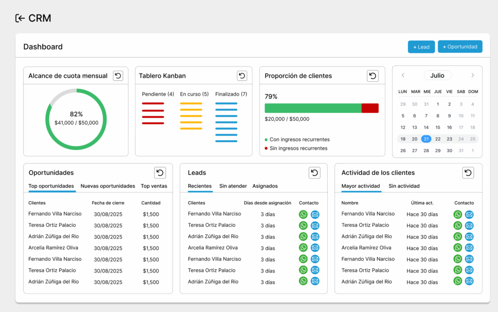 Diseñado para gestionar relaciones comerciales, cotizaciones, oportunidades y canales de comunicación en tiempo real. Permite vincular clientes directamente con sus dispositivos, líneas, historial técnico y facturación.